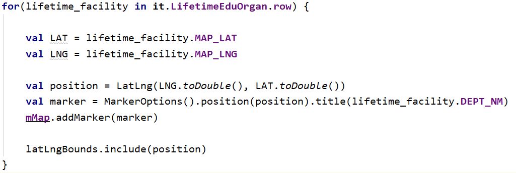 받아온 api의 MAP_LAT, MAP_LNG(위도, 경도) 정보를 받아와 LatLng를 통해 구글맵에 표시하고자 하였다.