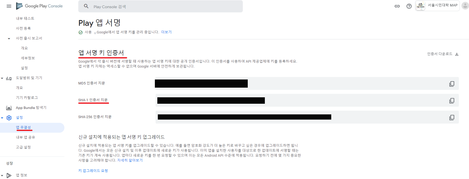 설정 -> 앱 무결성 -> 앱 서명 키 인증서 -> SHA-1 인증서 지문